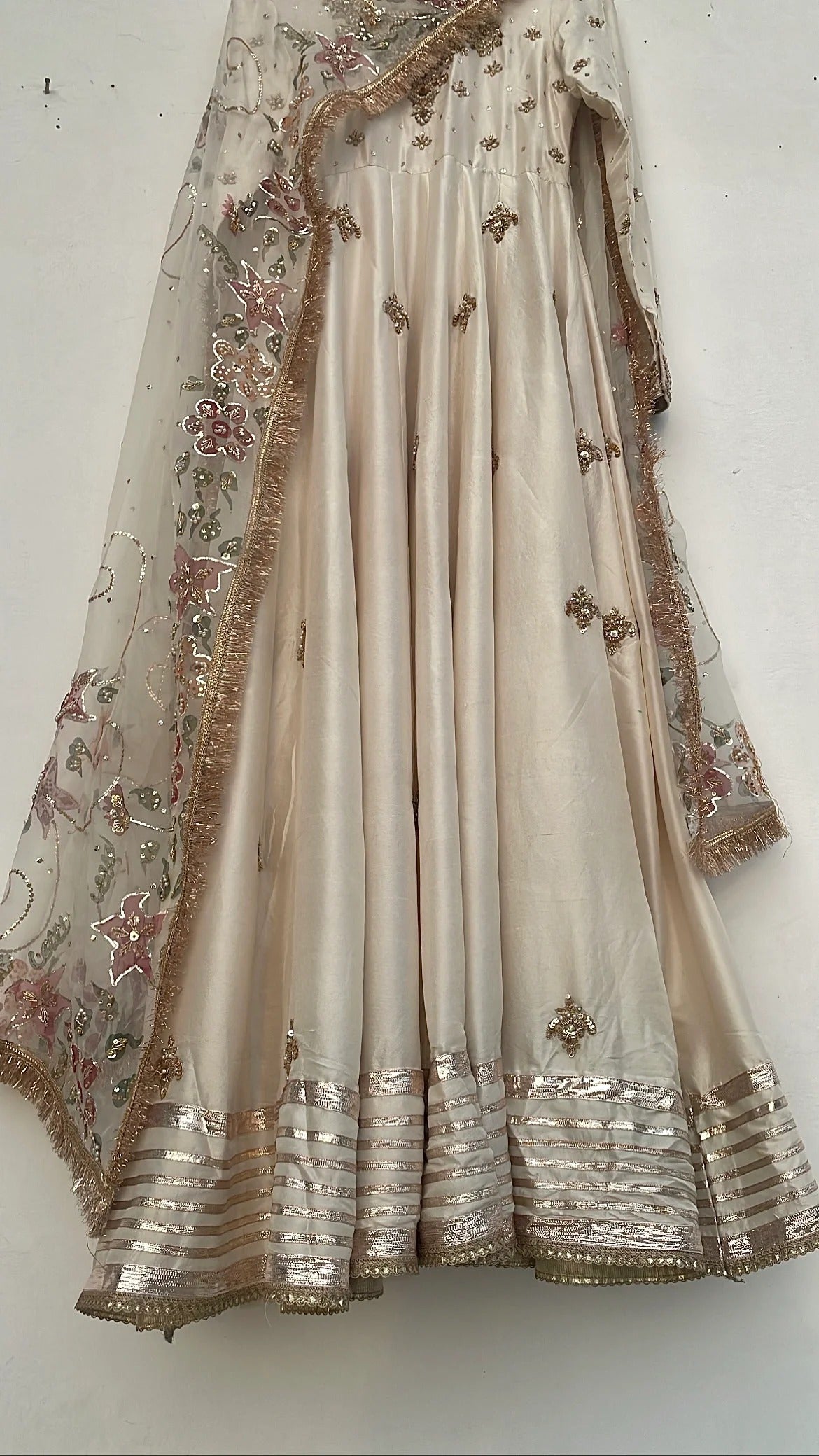 Experience timeless sophistication with our Nargis festive collection a distinguished three-piece ensemble curated for life's most significant moments. This thoughtfully assembled set pairs a hand-painted pure organza dupatta with an ornately embellished raw silk peshwas, each component reflecting superior artisanal skill and luxurious materials. Ideal for weddings, engagements, and festive occasions, this ensemble delivers the refined aesthetic and premium textures that embody grace and enduring elegance.